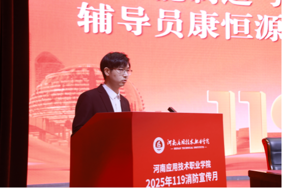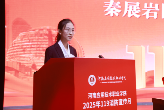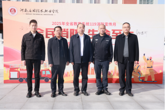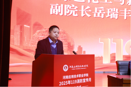 为响应全国消防安全工作部署,筑牢校园安全防线,11月12日上午,河南应用技术职业学院2025年119消防宣传月活动启动仪式在郑州校区学生活动中心隆重举行。我校校长薄新党,副校长常新中、黄振中,西流湖派出所所长杨忠印,中州消防站站长关亚林,辖区办事处相关负责同志以及我校部分师生代表共同参与此次活动。启动仪式由黄振中主持。