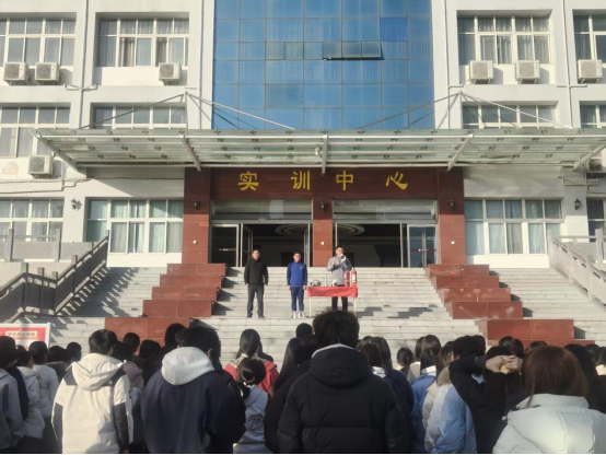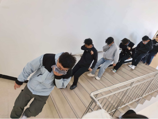 随后,随着模拟火灾警报声的响起,应急疏散演练正式开始。实训楼前烟雾弥漫,模拟“火情”突发。各楼层疏散引导员迅速到位,按照预设方案,引导学生用湿毛巾捂住口鼻,弯腰低姿,沿着墙壁快速、有序地向楼外安全区域疏散。过程中,学生们听从指挥,不推挤、不慌乱,严格按照疏散路线前进,仅用3分30秒,楼内全部参与学生便安全撤离至指定区域。