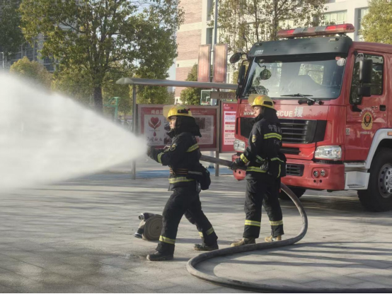 最后,富民路站的消防指战员为同学们演示了消防设备的使用方法。