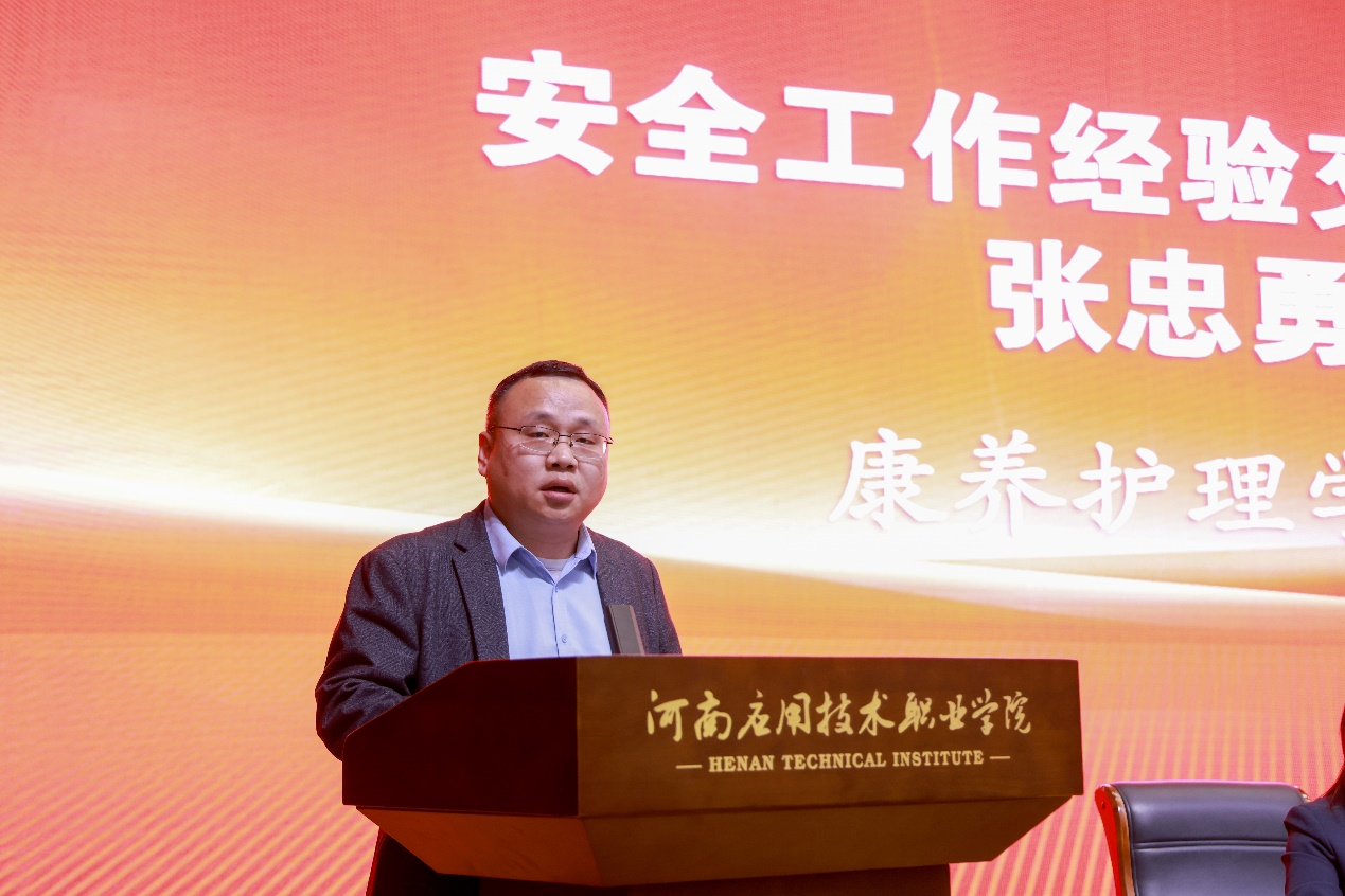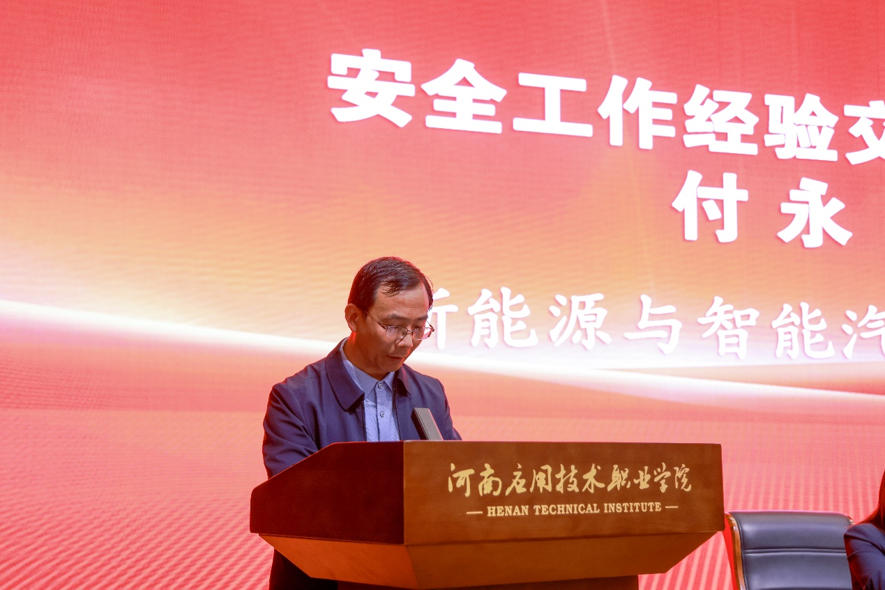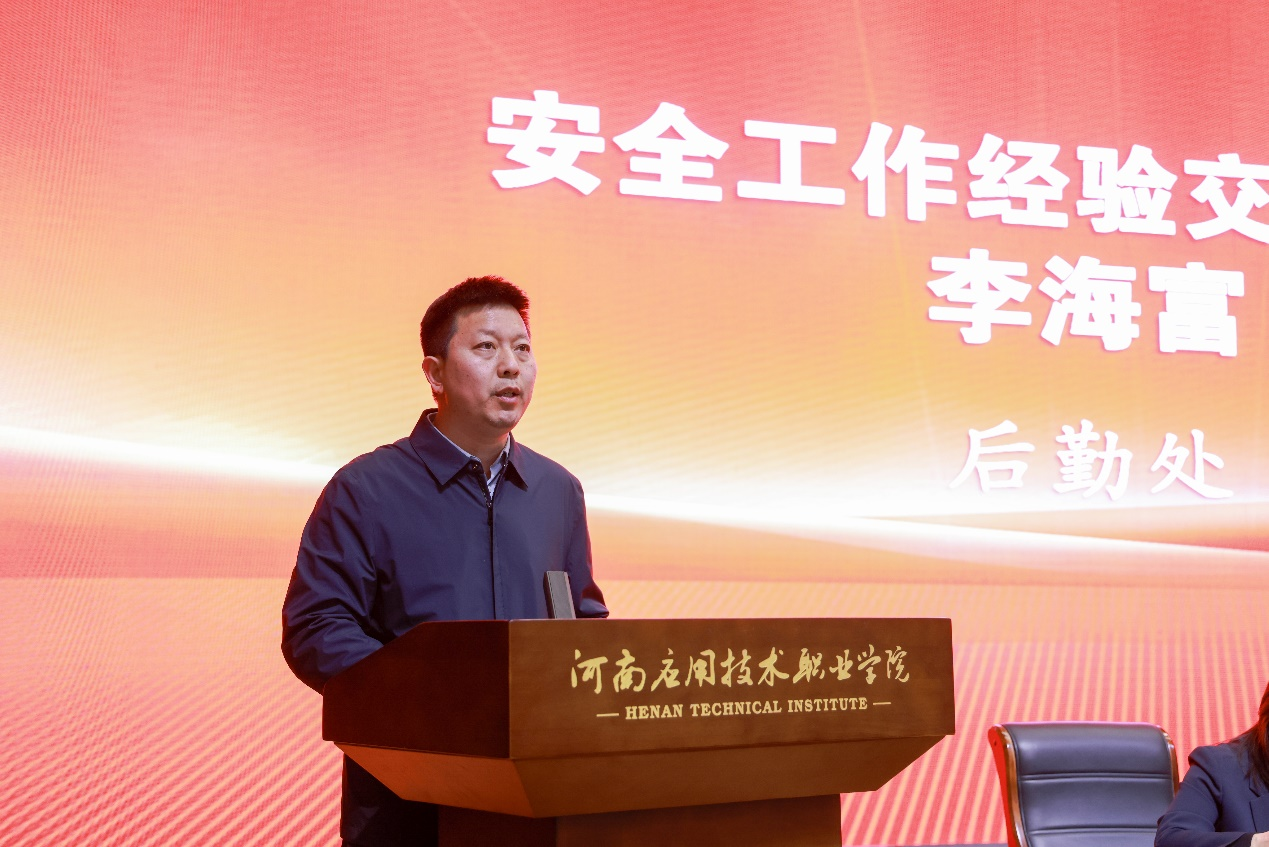 会上,后勤处处长李海富、康养护理学院党总支书记张忠勇、新能源与智能汽车学院党总支书记付永分别作安全工作经验交流。